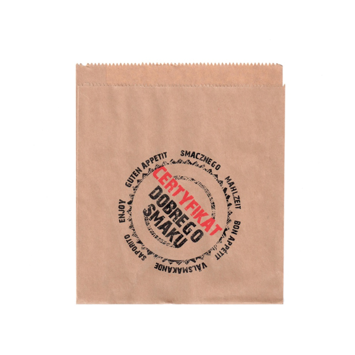 Brązowa papierowa koperta o wymiarach 16 x 17 cm, przeznaczona do podawania kebabów, burgerów oraz innych produktów typu street-food. Posiada nadruk „CERTYFIKAT DOBREGO SMAKU”. Sprzedawana w opakowaniach po 1000 sztuk.