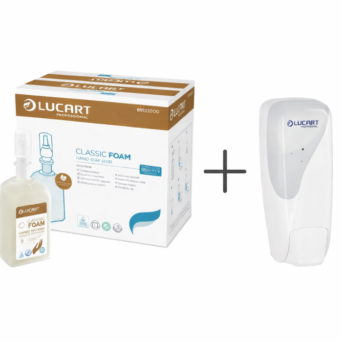 Zestaw zawiera sześć wkładów mydła w pianie Classic o pojemności 1000 ml oraz biały dozownik kompatybilny z systemem Identity Lucart. Produkt przeznaczony jest do utrzymania higieny rąk w miejscach o dużym natężeniu ruchu, takich jak restauracje, biura, szkoły, hotele czy centra handlowe.