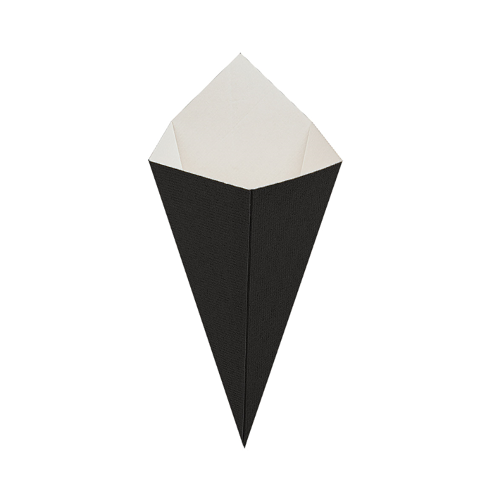 Czarny rożek na frytki z prestiżowej linii THEPACK® to nowoczesne opakowanie o pojemności 250 g, zaprojektowane dla gastronomii stawiającej na jakość i design. Wykonany z zaawansowanej technologicznie nano-mikro tektury falistej, łączy w sobie elegancję z funkcjonalnością. Jest idealnym rozwiązaniem do serwowania średnich i większych porcji frytek, krążków kalmarowych, churrosów czy skrzydełek z kurczaka. Kontrastowe zestawienie czerni na zewnątrz i bieli wewnątrz doskonale eksponuje zawartość, przyciągając wzrok klientów.