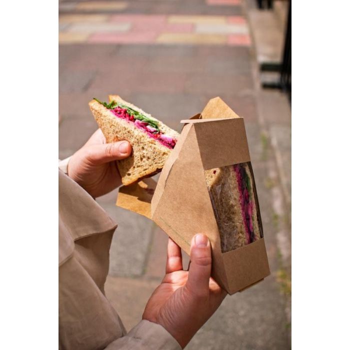 Wolne od plastiku, 100% biodegradowalne pudełko na kanapki. Tłuszczoodporny karton kraft oraz biodegradowalne okno PLA. Świetnie sprawdzi się w restauracji typu fast food lub cateringu jak również w innych lokalach serwujących posiłki na wynos. Idealny na gotowe kanapki, które znajdą się na sklepowych półkach lub stacjach benzynowych.