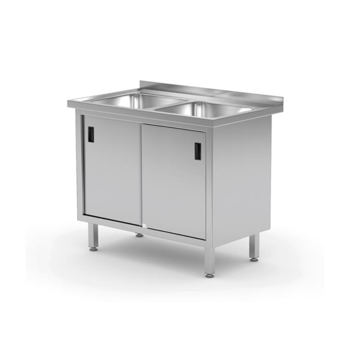Opis / Stół z dwoma zlewami, szafka z drzwiami suwanymi, o wym. 1000x600x850 mm