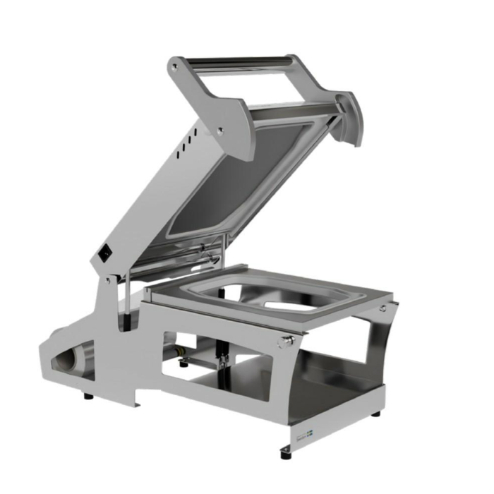 Obsługa urządzenia jest intuicyjna – wystarczy umieścić pojemnik w kasecie, rozwinąć folię i opuścić pokrywę, aby uzyskać szczelne zamknięcie. System automatycznego odcinania folii po obrysie zapewnia estetyczny i powtarzalny efekt.