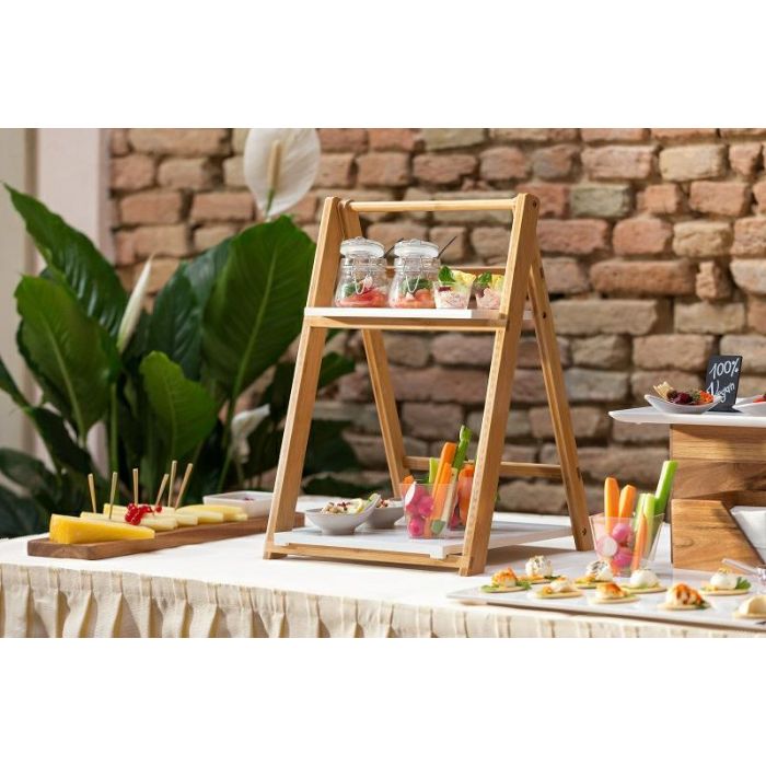 Stand bufetowy Altazina bambusowy z białymi półkami.